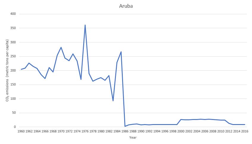 Finally, Aruba was removed from the data prior to processing. It is an outlier in terms of carbon dioxide emissions, with well over 100 metric tons of carbon dioxide emissions per capita for a number of the years in question. It’s data is shown separately below.