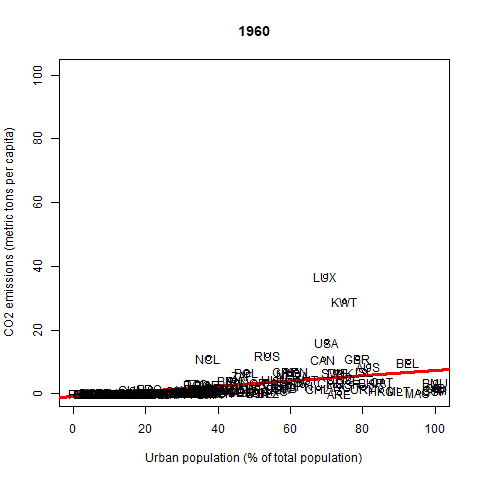 Using the statistical computing and graphics application R, with time series data from the World Bank on metric tonnes of carbon dioxide emissions per capita and urban population as a percentage of total population, the animation below was produced to investigate the relationship between urbanisation and carbon dioxide emissions from 1960 to 2016.