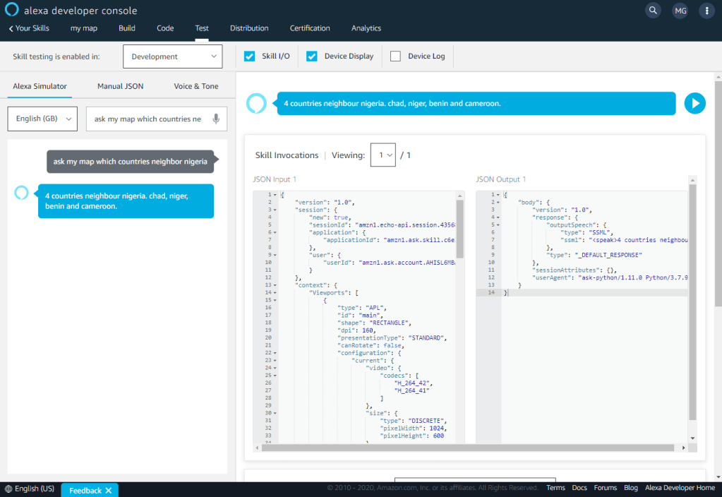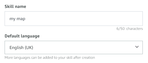 In the subsequent page, give your skill a name i.e. ‘my map’ and set your default language to English (UK).