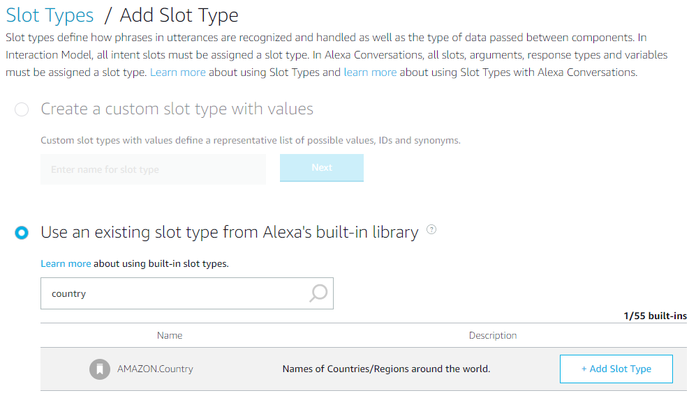 1. Click the ‘+Add Slot Type’ button and in the subsequent page, select ‘Use an existing slot type from Alexa’s built-in library’