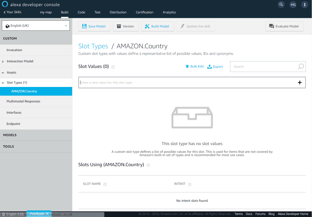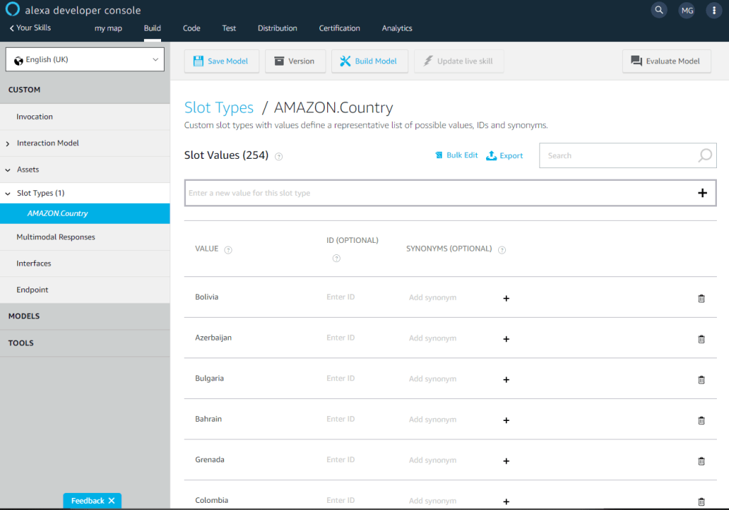 In the left hand side menu click on ‘Slot Types (1)’ and expand the menu and then click on the newly created AMAZON.country slot.
