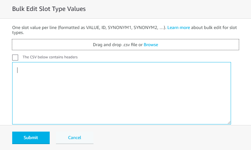 Click the ‘Submit’ button to add the country slot values to your skill.