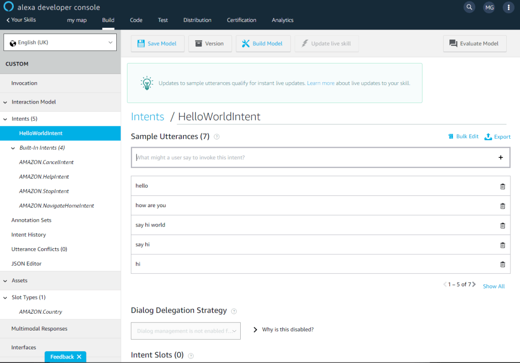 To create the neighbour intent expand the ‘Interaction Model’ left hand side menu item and then expand the ‘Intents (5)’ sub menu item. Next click on the default ‘HelloWorldIntent’.