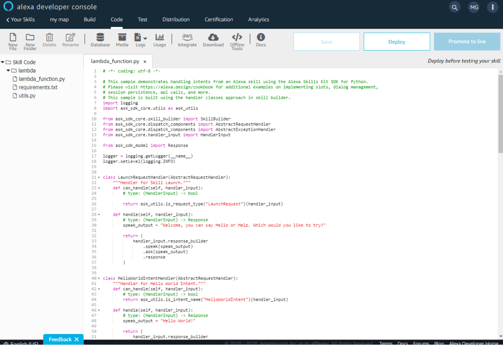 The last part of the skill creation is to update the default python code. To access the code, click on the ‘Code’ menu item at the top of the page.