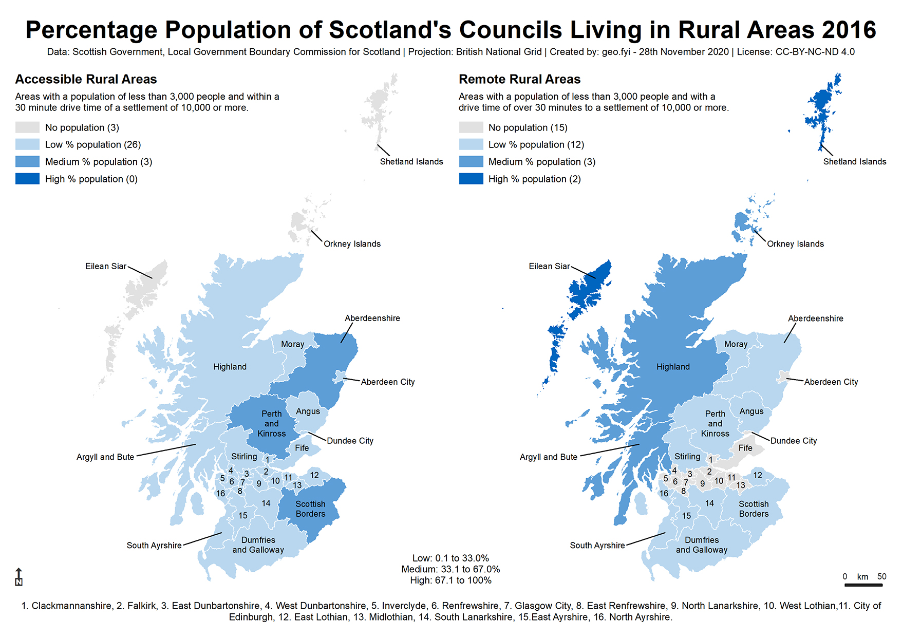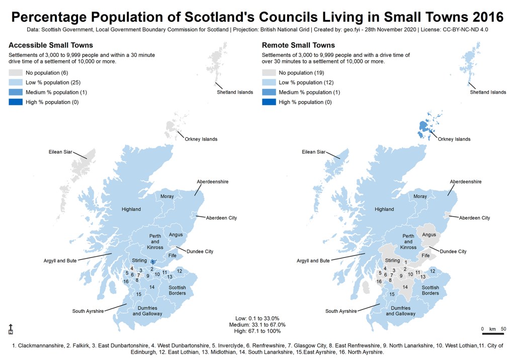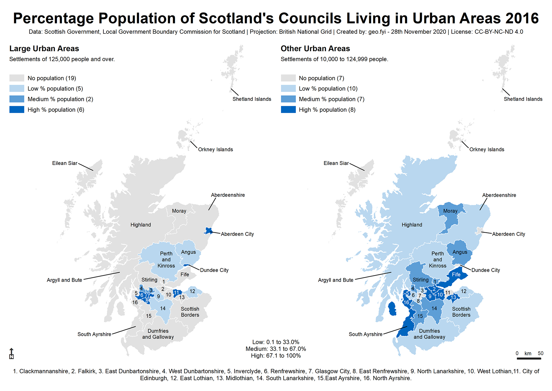 The following maps show the percentage population of Scotland’s councils classified into three equal classifications, living in the four different settlement classes of the 6-fold classification system.