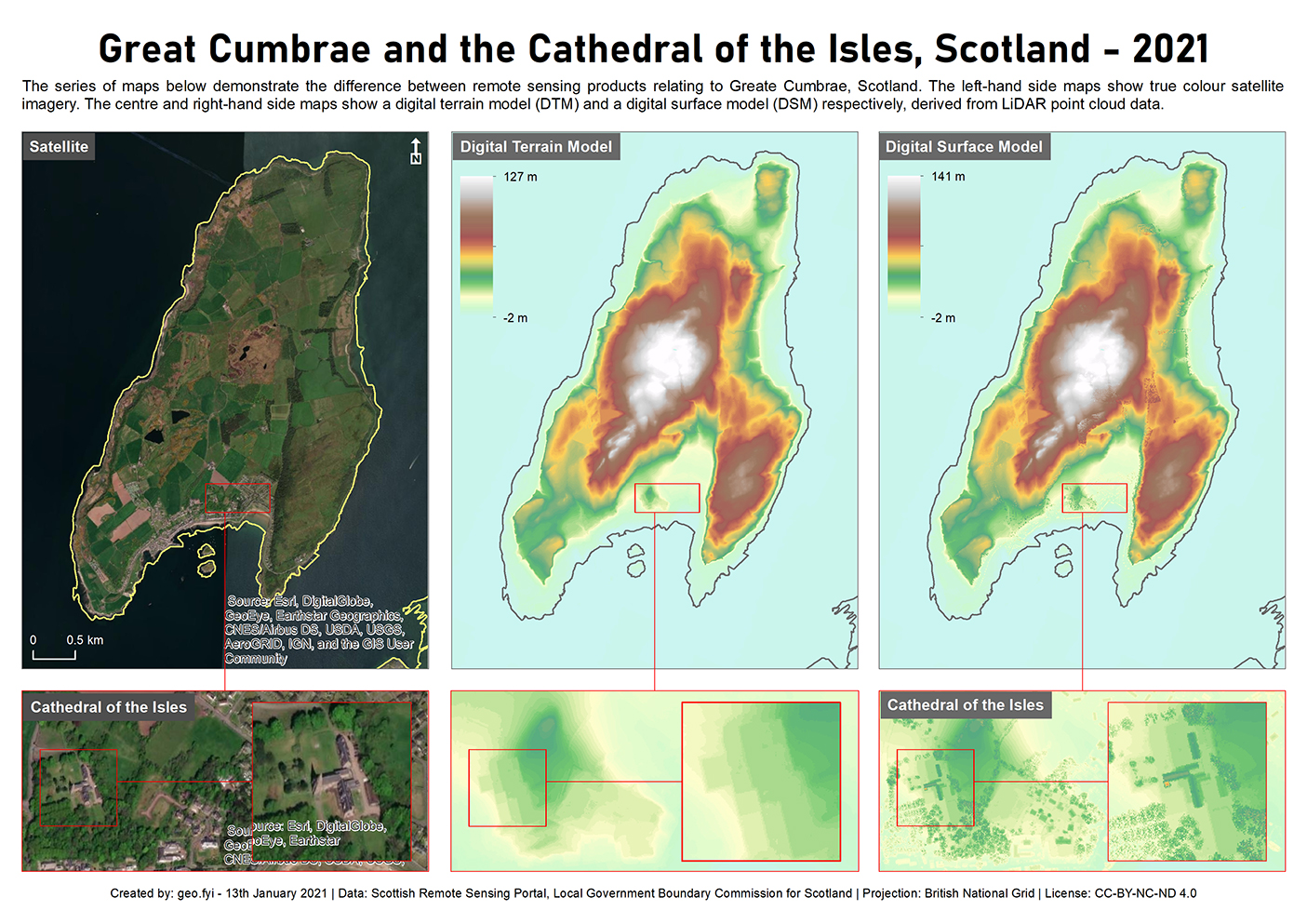 The map below shows a satellite image of Great Cumbrae along side a DTM and DSM derived from LiDAR point cloud data. The DSM clearly shows surface artefacts such the trees and buildings associated with the Cathedral of the Isles. As expected, the DSM maximum height (141m) is greater than the DTM maximum height (127m).