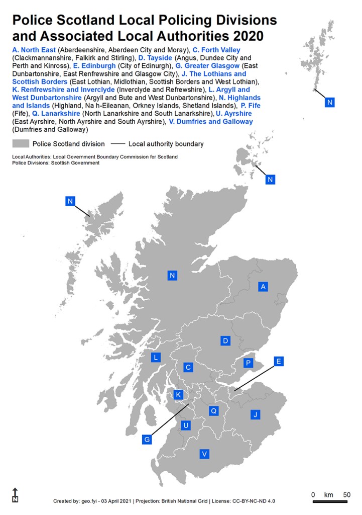 There are 13 policing divisions in Scotland. Each has a unique letter identifier and geographically align with one or more local authorities.