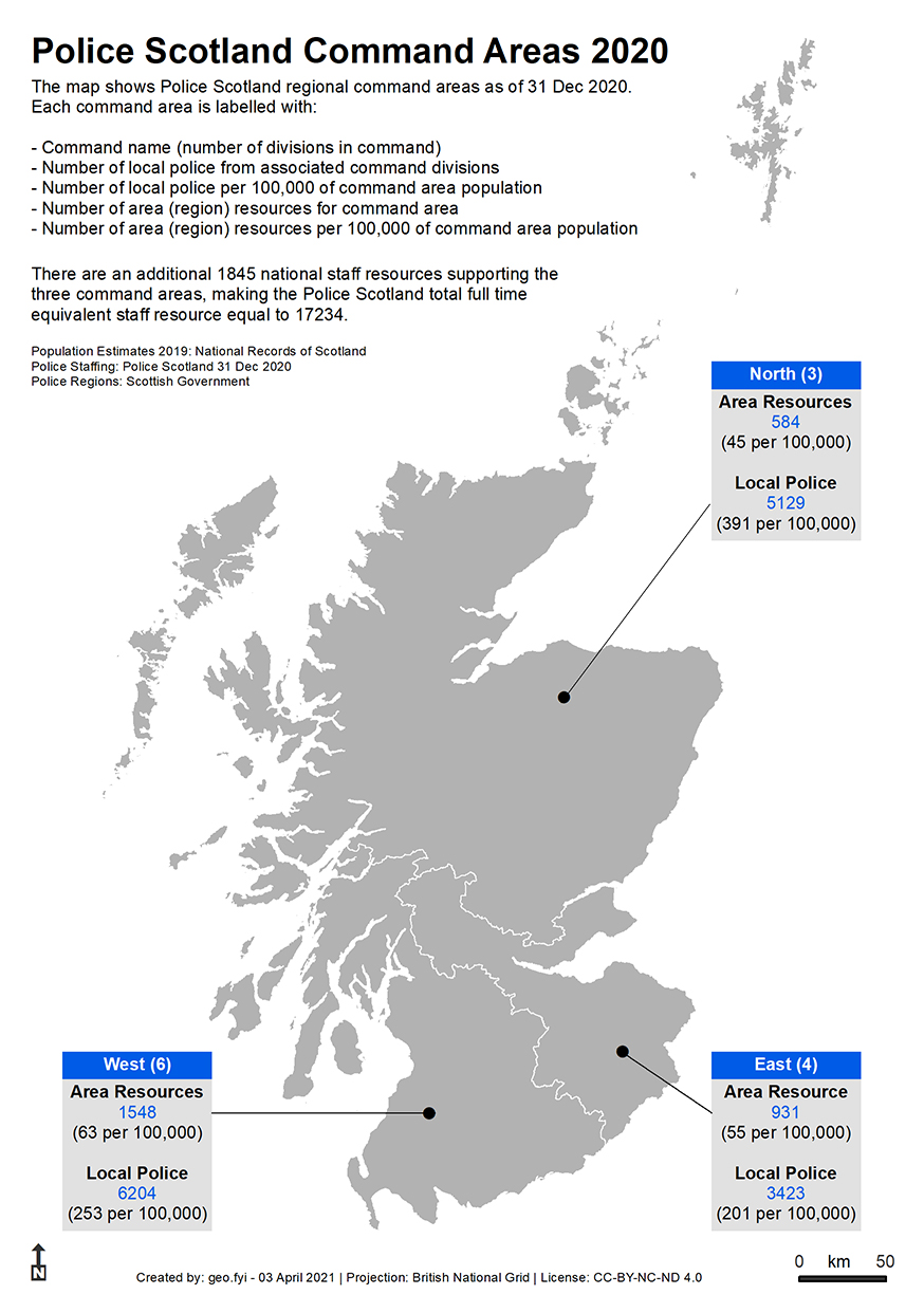 Using Police Scotland policing division boundaries, police officer numbers and population estimates for 2019, the maps below explore the geography of Police Scotland’s policing commands, divisions and subdivisions along with their associated police officer resources.