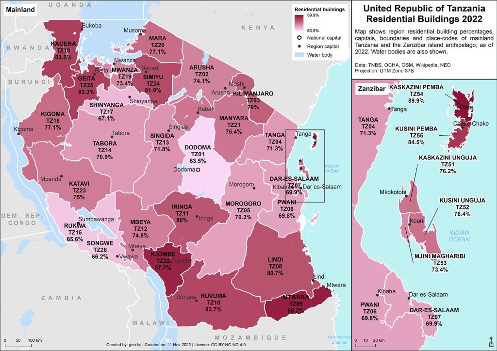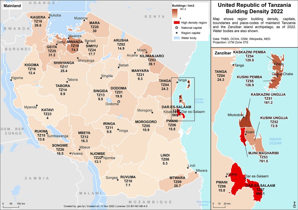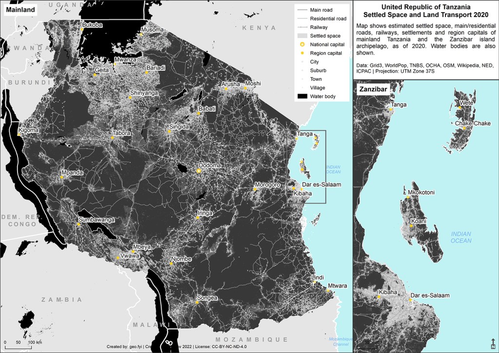 Populations and buildings are not evenly distributed across Tanzania, but rather concentrated in settled spaces.