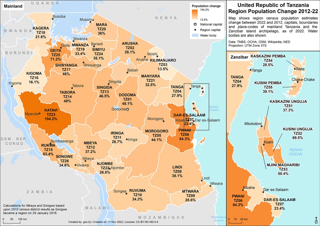 Katavi region has more than doubled in population since 2012. Other regions have also seen a large population growth.
