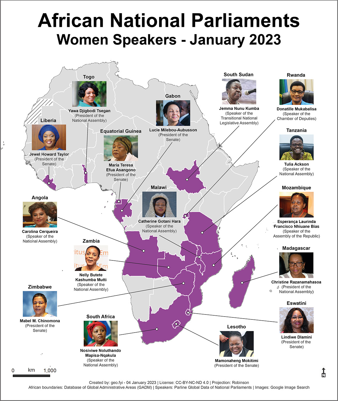 At the time of publishing in February 2023, there are five women as heads of African states and parliaments.