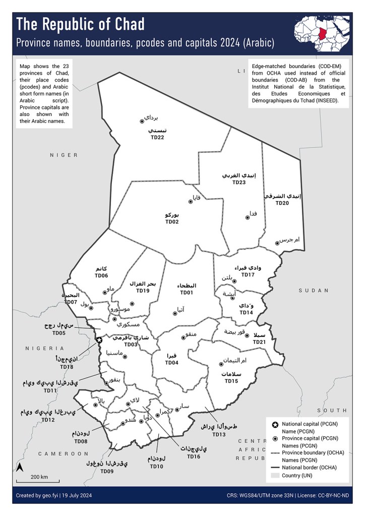 The provinces of the Republic of Chad and their capital cities have French and Arabic names.