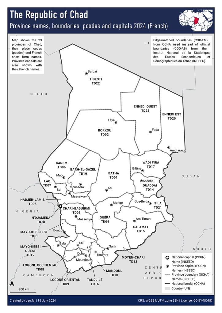Subnational edge-matched boundaries (COD-EM) from OCHA (fitting the UN Geocartographics 1:1m international boundary set) were used for the maps instead of the official boundaries (COD-AB) from the Institut National de la Statistique, des Etudes Economiques et Démographiques du Tchad (INSEED).