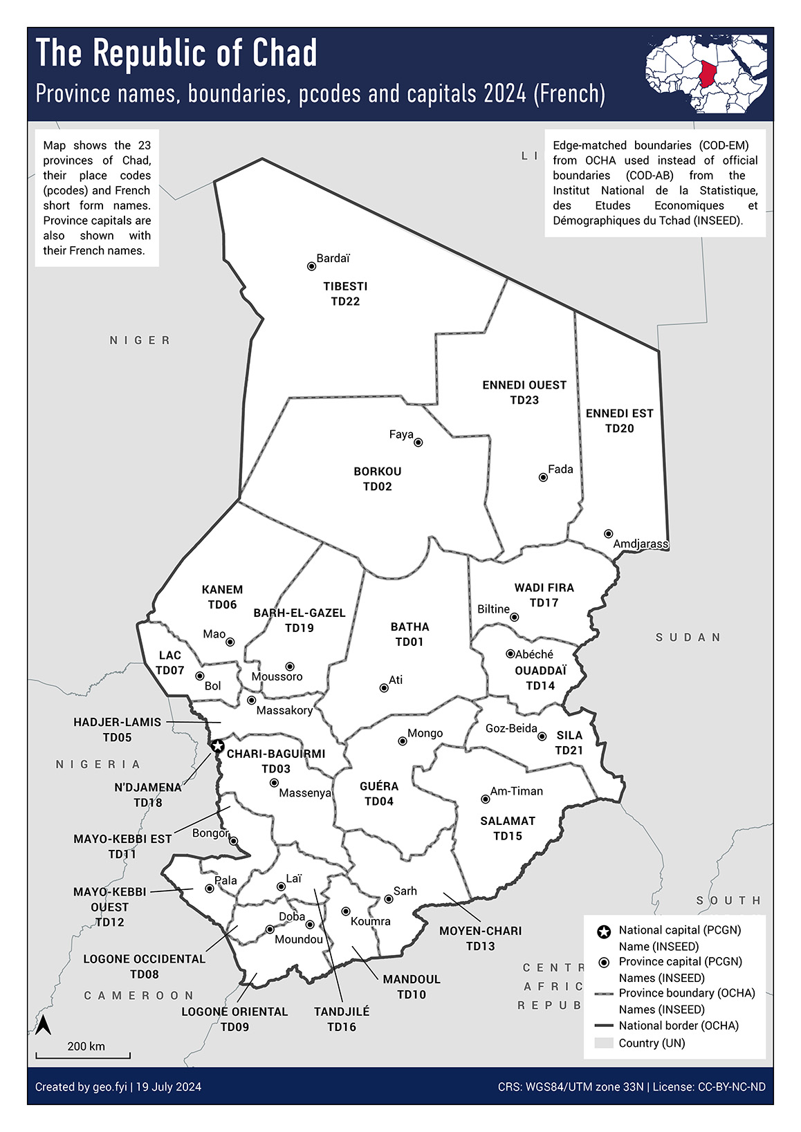 Subnational edge-matched boundaries (COD-EM) from OCHA (fitting the UN Geocartographics 1:1m international boundary set) were used for the maps instead of the official boundaries (COD-AB) from the Institut National de la Statistique, des Etudes Economiques et Démographiques du Tchad (INSEED).